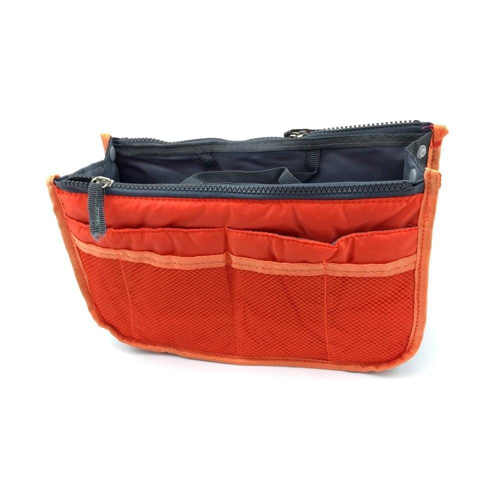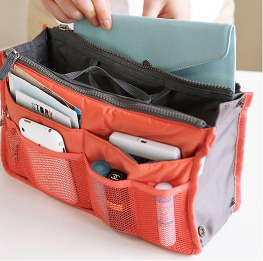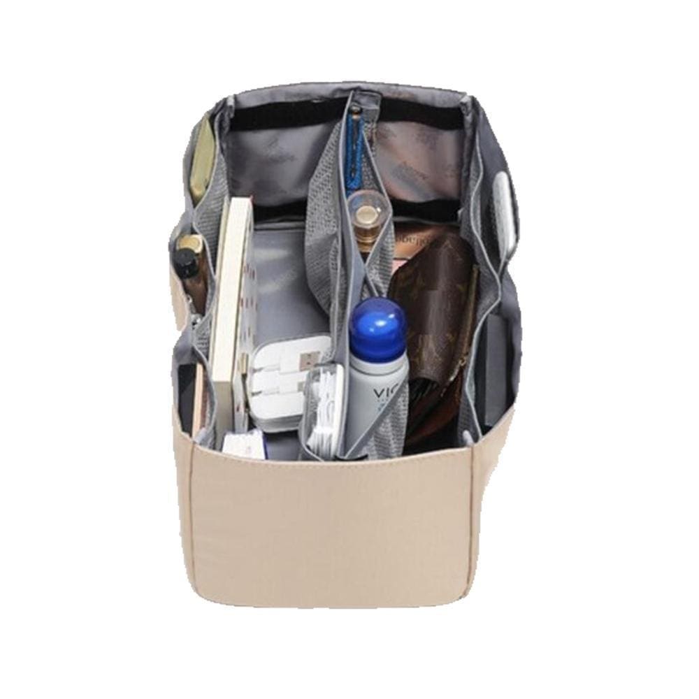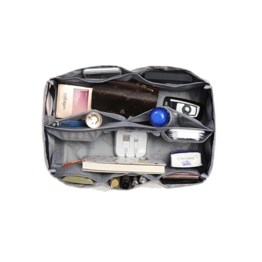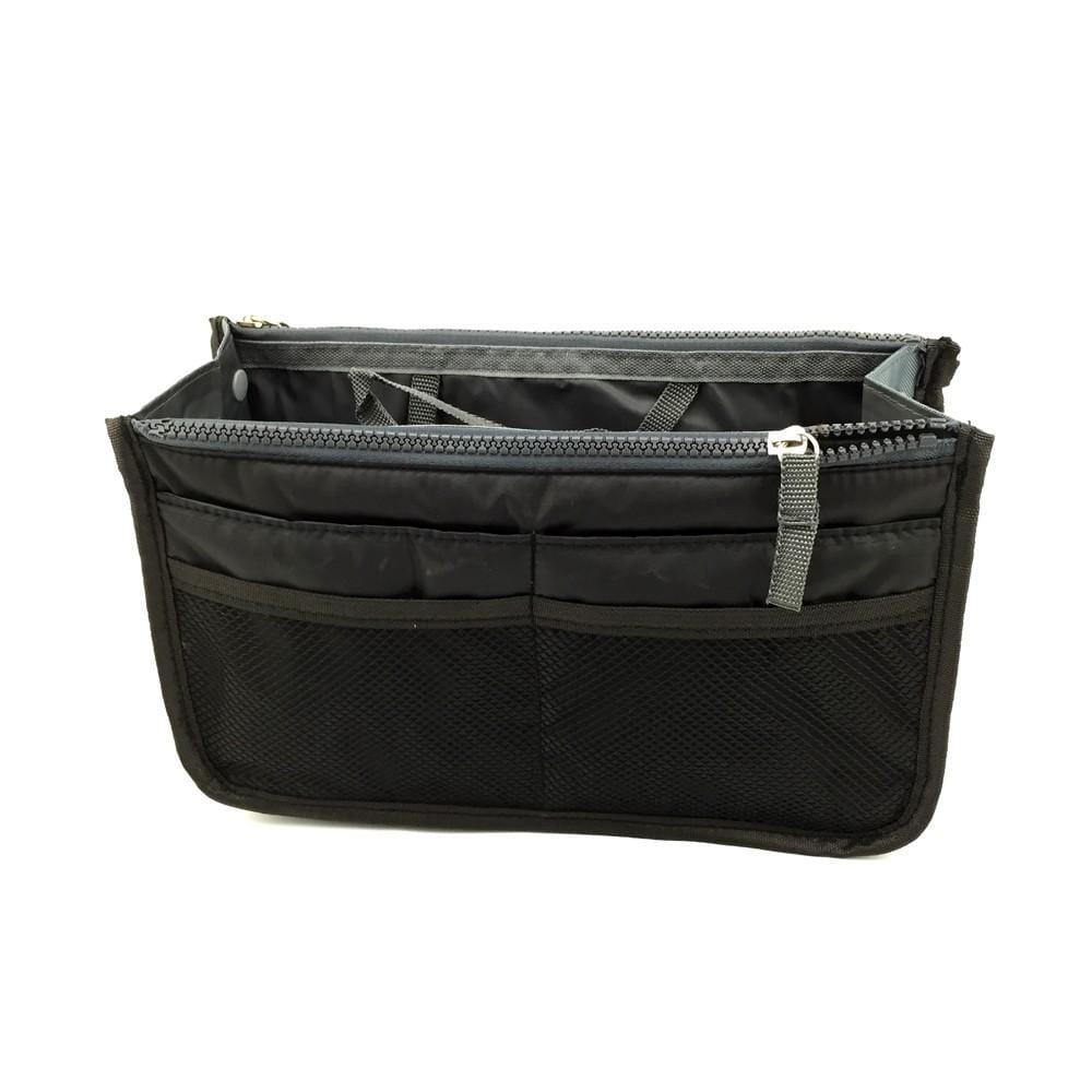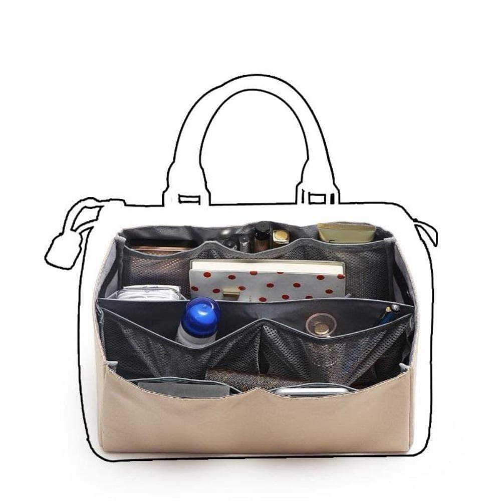 Organiseur pour Sac avec 3 grandes poches intérieures, 2 fermetures, de 10 poches extérieures , boutons pressions pour ajuster sa largeur, deux poignées pour le retirer facilement du sac, une matière résistante et protectrice,