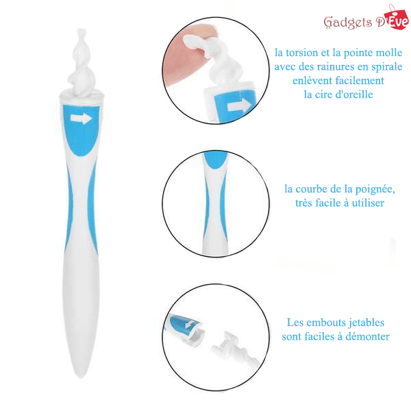 Avec ce produit, vous ne r isquez pas d'endommager vos tympans ou de pousser la cire plus loin dans votre oreille. Il est conçu pour fonctionner de manière sûre et efficace à chaque fois. Un moyen sûr et pratique de nettoyer vos oreilles. Ajoutez simplement la pointe à la poignée, placez-la dans le conduit auditif et tordez-la selon les instructions. Livré avec 16 embouts (recharges disponibles)!