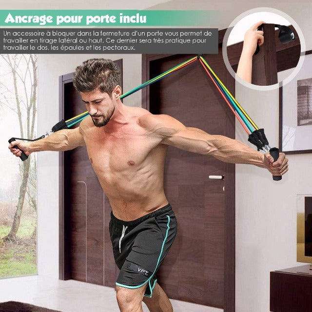 Que vous soyez un homme, une femme, un débutant ou un sportif professionnel, avec ce kit de 11 pièces, vous avez tout ce dont vous avez besoin pour faire du sport chez vous : 5 bandes de couleurs et résistances différentes en latex naturel, pour un entraînement optimal à la maison, au bureau ou en déplacement.