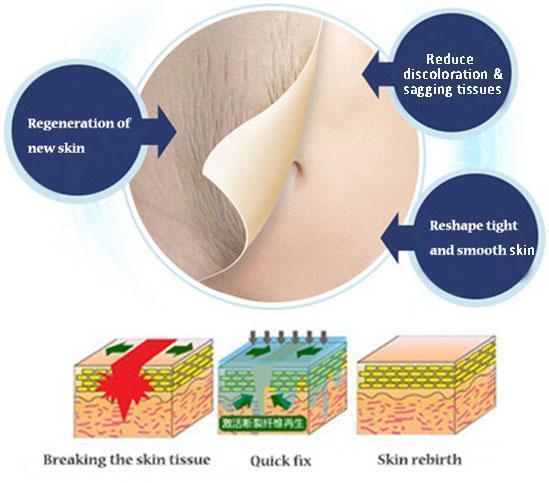 Elle est utilisée pour les vergetures même très marquées, ancienne ou pas, les cicatrices, et la peau d'orange (fesses et ventre après grossesse par exemple).