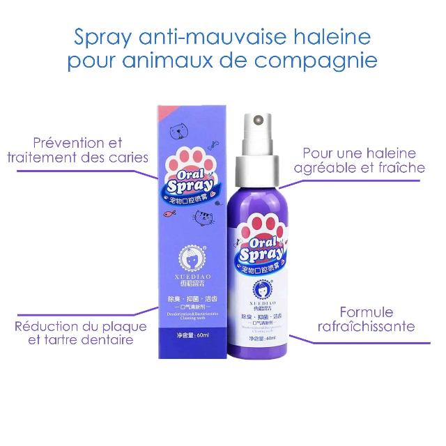 Ce spray anti-mauvaise haleine aux extraits naturels limite la formation de la plaque dentaire, permet une élimination efficace de la mauvaise haleine de votre animal renforce la santé des gencives et contribue à une bonne hygiène.