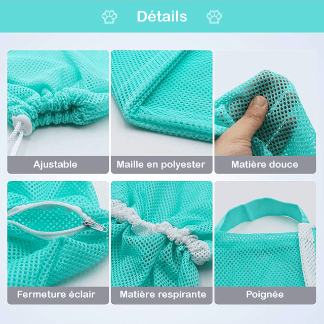 Ce Sac-filet multifonction vous permet de lui faire prendre le bain et de le sécher, de lui prodiguer des soins comme la coupe des griffes, le nettoyage des yeux, des oreilles ou des dents, de lui administrer des médicaments et de faciliter les soins chez le vétérinaire, examens, injections.. Il peut également être utile pour les petits chiens, lapins et autre petits animaux.
