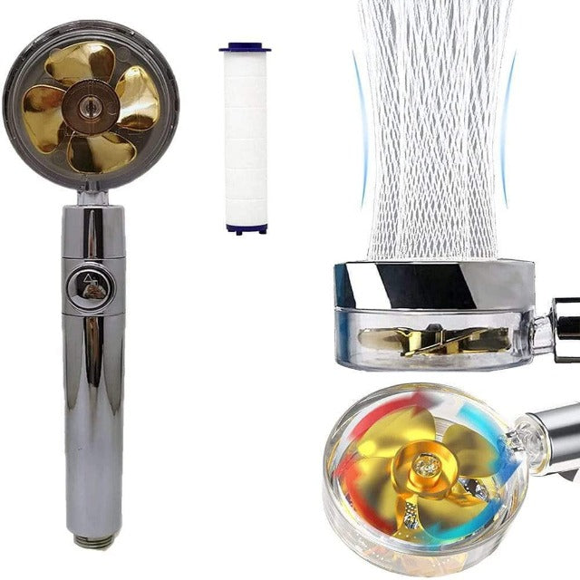 Grâce à son ventilateur turbo avec bouton d'arrêt de moulin à vent intégré, l'eau pénètre dans le pommeau de douche écologique SHOWRIN, mélangée à l'air et cela produit un fort débit d'eau. Une meilleure expérience de douche, appuyez simplement sur le bouton du pommeau de douche anti-calcaire, le débit d'eau s'arrête.